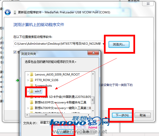 3、如果你的电脑是win7系统电脑,需要在设备管理器出现MT65xx感叹号驱动的时候,手动双击它,并选择“驱动程序---更新驱动程序----浏览计算机以查找驱动程序软件-----浏览------选择对应的驱动文件夹---下一步----始终安装---安装完成”,如图:
