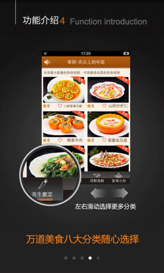 包含智能选菜、菜系搜索、口味搜索等47种快速搜索功能,还有明星主持推荐的菜谱??无论您带着哪种目的搜索,都会有所收获。