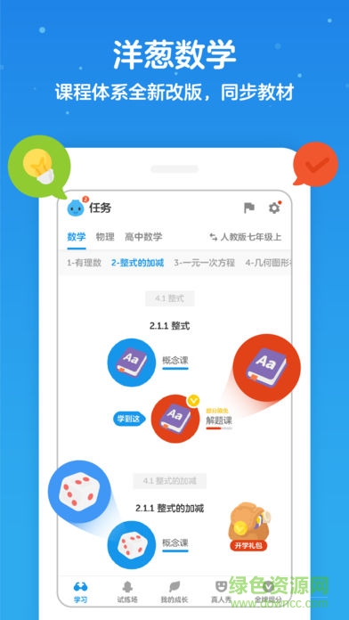 洋葱数学ipad是专为中学生提供的一款数学学习软件,app中将微课与习题结合到一起,提供了动画授课、专项练习等多种学习课程,让你全面的掌握知识结构,轻松的提高学习成绩,需要的朋友欢迎来绿色资源网下载!