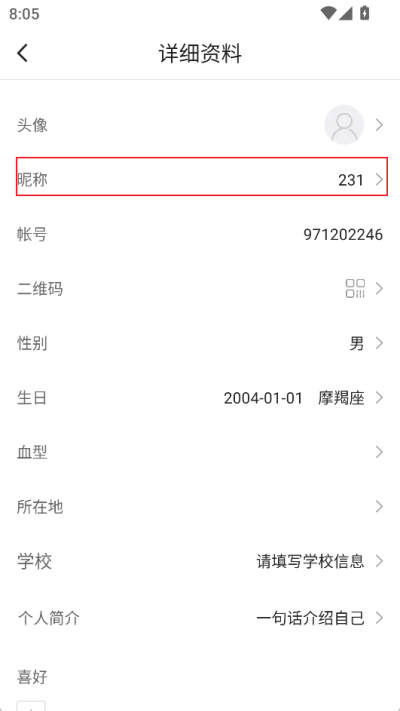 3、点击后即可进入详细资料界面,在这里可以看到自己的一些信息,点击其中的【昵称】一栏进行设置;