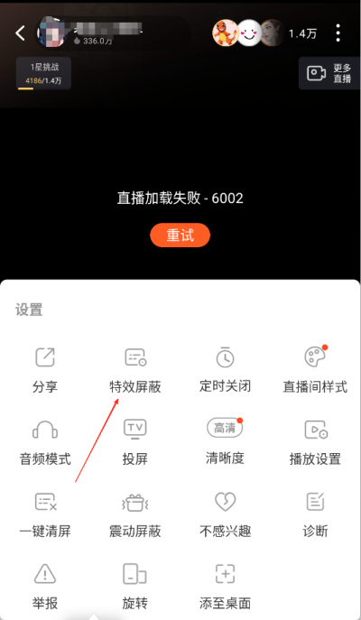 3、点击后会在下方的位置弹出设置功能界面,在这里有许多的功能设置可以选择,点击其中的【特效屏蔽】选项;