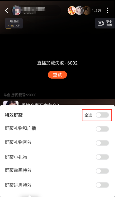 4、点击后可以进入特效屏蔽界面位置,在这里可以自定义屏蔽相应特效,也可以选择上面的【全选】选项,一次性关闭所有的特效效果。