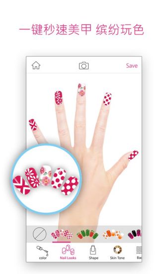 你可以立即拍摄或使用内建手模照片来进行设计,并透过肤色来个人化你的美甲照片