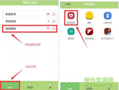 2.登录成功后,底端选择“消息菜单”,然后点击“班级通知菜单”,进入班级通知页面界面: