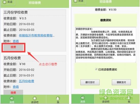3.点击“班级缴费”按钮系统会显示出当前需要缴费的界面。点击缴费按钮按照支付使用银行卡选择缴费方式进行缴费。