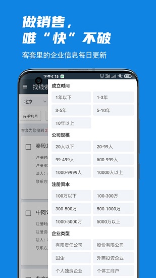 --销售的时间是要用来成交的。帮助销售人员快速的获取到客源,打破销售困境,增加自己的收益;每个用户都可以查看到客户的详细信息,包括了公司的企业名称、注册资本、企业法人、联系方式等等,用户能在线获取到重要资讯,提供针对性的销售服务。