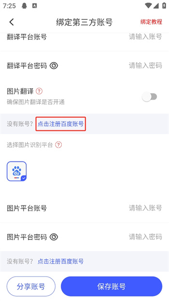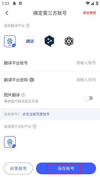 3、在这里选择一个你想要绑定的翻译平台,输入你绑定的翻译平台的账号和密码,接着点击下方的【保存账号】就可以完成自己的第三方平绑定操作了;
