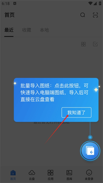 1、来到应用之后会有一个使用的提示窗口,提示你点击这里,就可以快速的进行各种图纸查看任务了,满足不同格式之间的查看,轻松实现各种二维或者是三维图纸查看;
