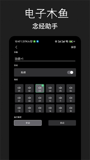 - 拥有多种敲击模式,手动和自动模式,在自动模式下,自由设置参数,自动敲打屏幕上的木鱼。