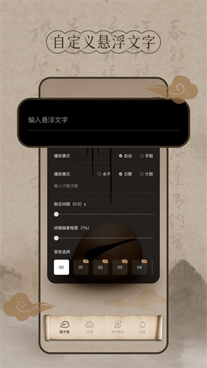 功德木鱼是一款电子木鱼模拟器,让大家在手机上就能模拟真实的木鱼敲击声音,简单的操作趣味体验,每次敲击电子木鱼还有悬浮文字显示,让大家可以释放生活中的压力、疲惫等等,支持用户自定义设置,带来多种模式可设置。