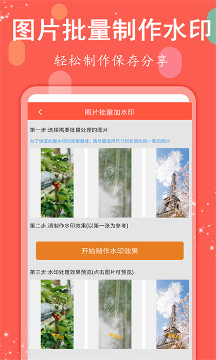 1.支持随手快拍加水印的水印相机,一拍立马加上水印。水印效果可以放在视频任意位置,让你的视频留下专属于你的文字或Logo!