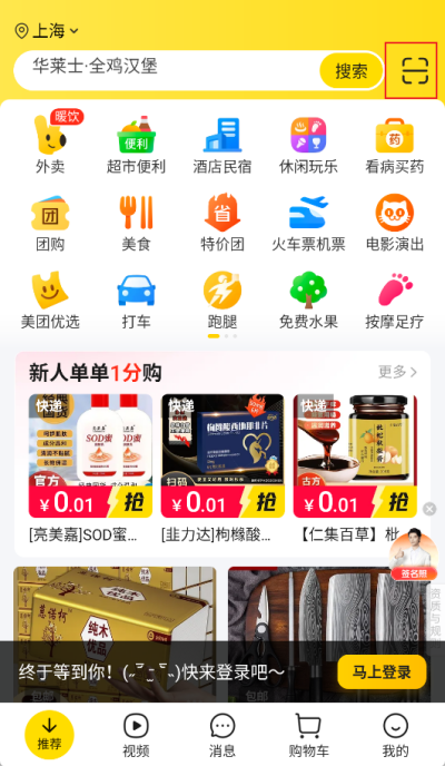 1、首先打开下载好的美团外卖APP,进入软件后在右上角的位置即可看到扫一扫的功能选项,点击一下即可进行扫描;