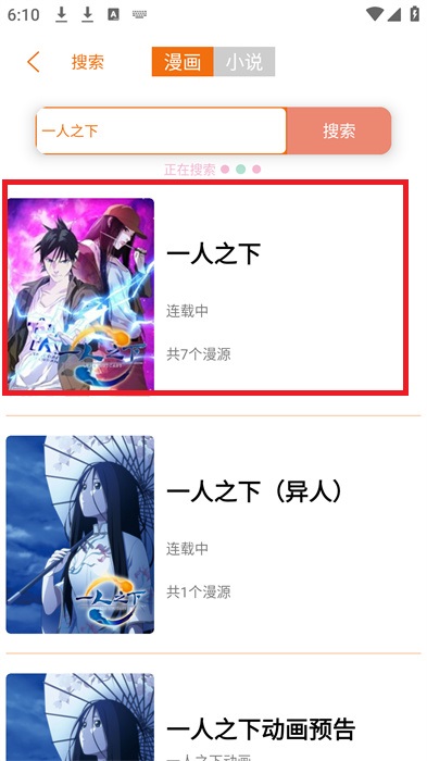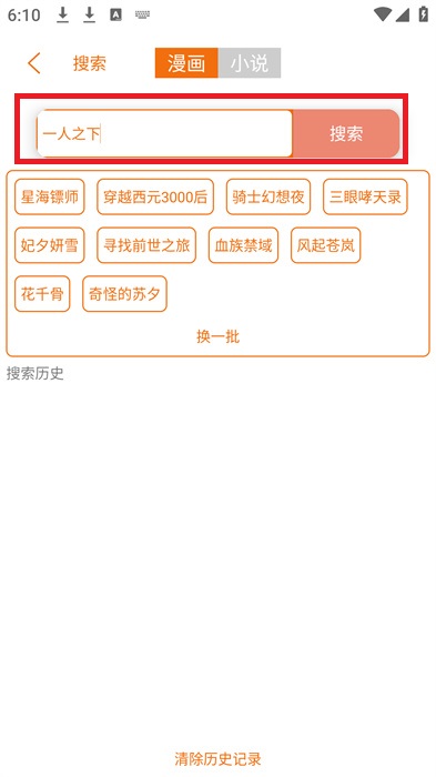 2、搜索页面中,我们就可以输入想要看的漫画作品名字,比如【一人之下】进行搜索;