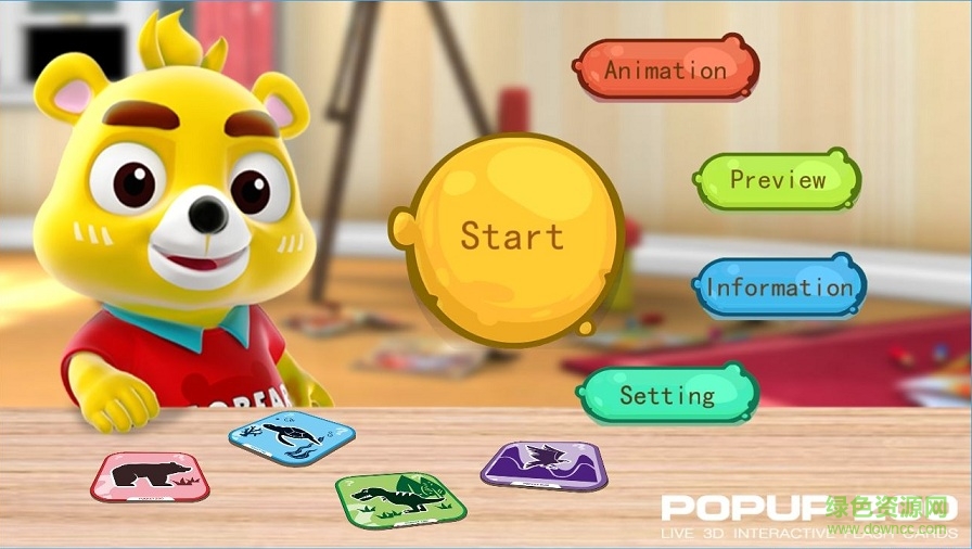点击主菜单上的“开始”按钮,通过摄像头捕捉实体卡片,在设备屏幕上相应的动物会立即出现并牢牢站立(或悬浮)在卡片上,随后可以点击屏幕上的动物模型与其实现互动。(尚未激活应用的用户可访问: www.neobear.com/m.html,下载并打印试用卡片)