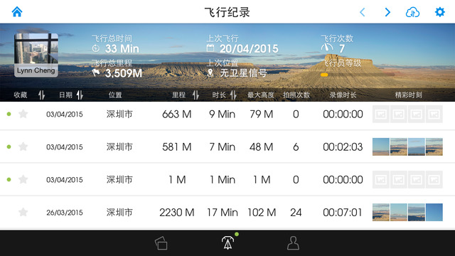 用户中心界面包括相册,飞行记录以及账户功能。其中,用户可通过相册功能导出相机SD卡中存放的数据,飞行记录保存了飞行数据,可通过账户界面查看DJI账号的一些常用信息