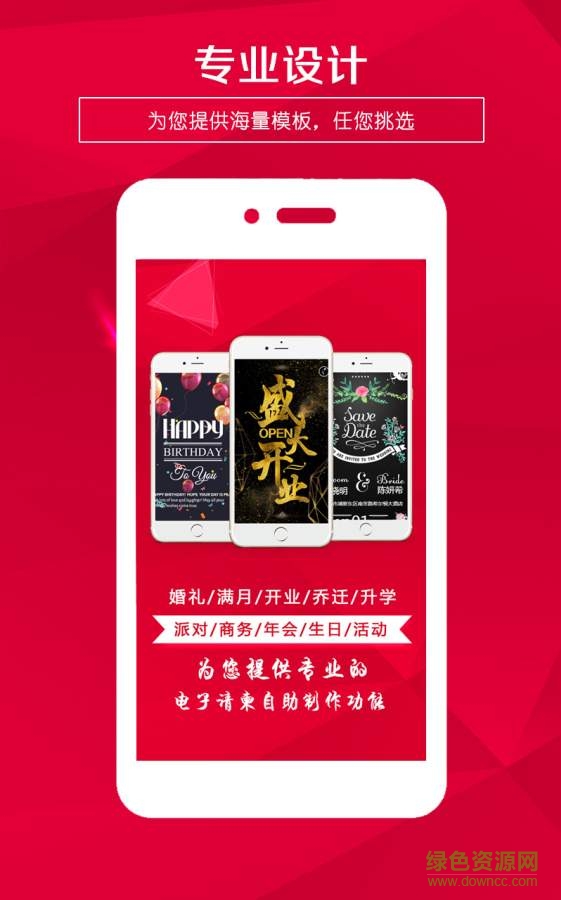 1.添加乔迁邀请、开业、生日、节日贺卡、婚礼、邀请函等模板;