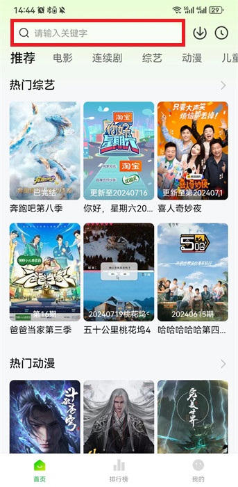 1、打开软件,在软件的主界面中点击上方的【搜索框】然后就可以进入到搜索框中;