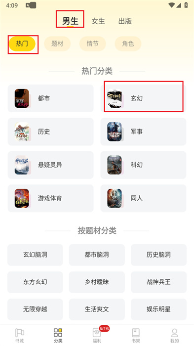 2、可以按照自己的喜好来进行小说的筛选,例如通过依次点击【男生-热门-玄幻】来进行筛选;