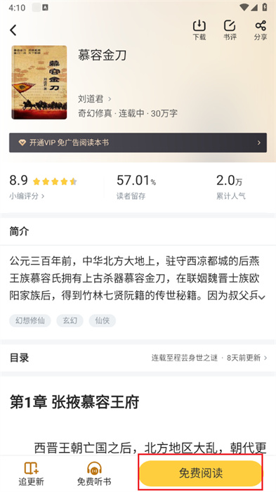 5、最后点击屏幕右下角的【开始阅读】按钮即可进行小说的阅读。