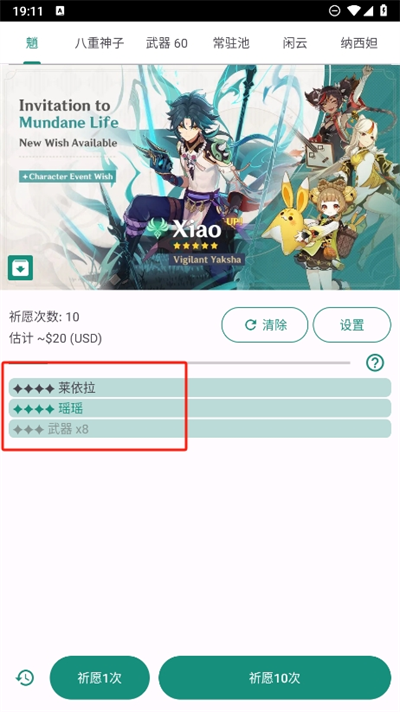 3、这里可以看到自己十连抽的模拟概率,大家可以根据模拟的抽取数据进行真实的祈愿哦;