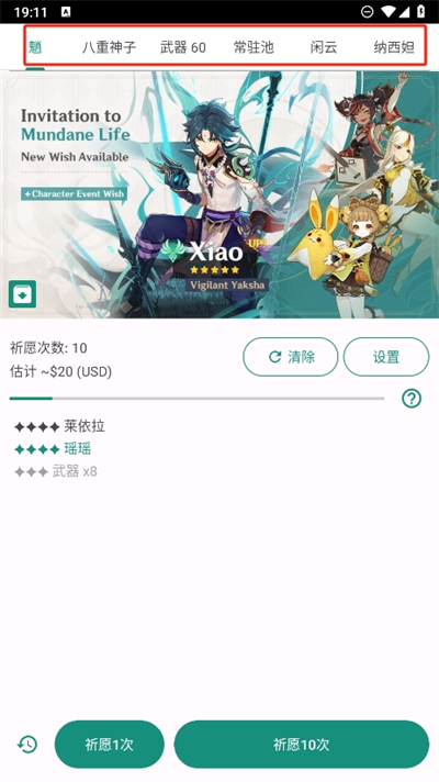 4、在这里还能切换不同的角色进行模拟祈愿,而且每一次的祈愿都会进行全部的数据记录。
