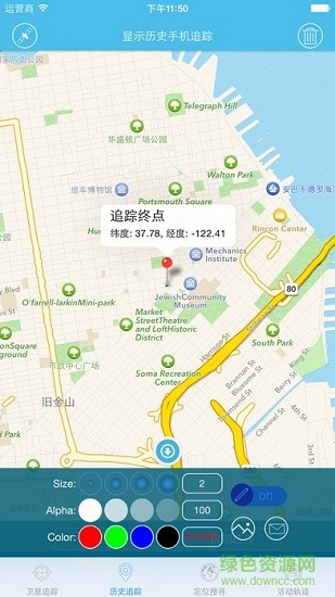 2,卫星追踪,实时跟踪并显示目标的轨迹;你可以在普通地图和卫星地图之间切换;自定义追踪:你可以不限于默认的跟踪,你可以自定义轨迹,自定义轨迹可以不受时间限制,随时追加纪录;建立监控点:你可以设置多个监控点,当你打开记录器,目标接近监控点(或者监控点附近的基站)1000米、500米、50米时,系统会给出声音和文字提示,当程序处于后台运行时,系统也会给出语音提示;
