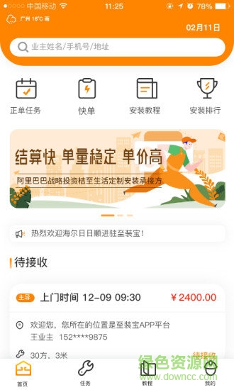 拥有海量订单,当用户定位自己城市之后即可发现同城业主发布的海量安装需求订单;