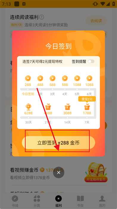 3、切换到【福利】页面,每日进行签到也可以获取金币,如果害怕忘记可直接开启推送通知;
