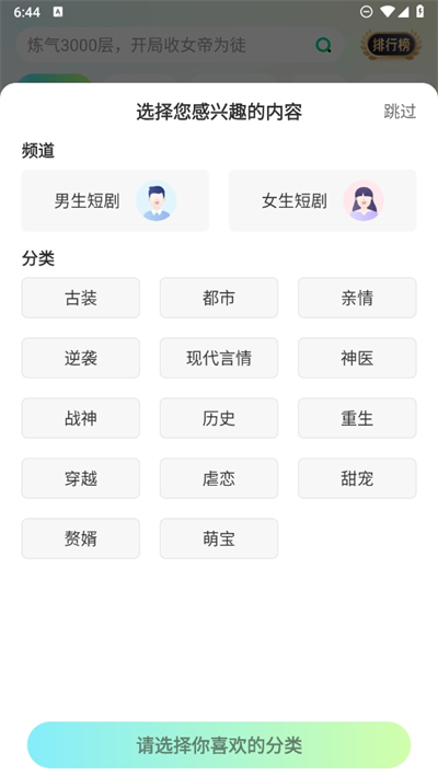 1、进入短视频的时会根据自己的喜好选择感兴趣的内容,也可以选择直接跳过有更多的类型选择;