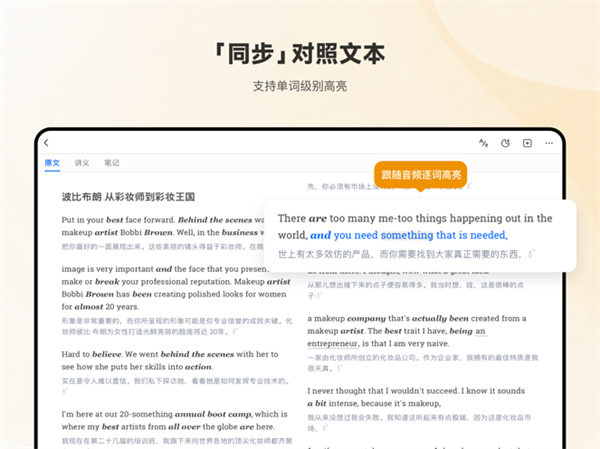 拥有每天更新的海量听力库,并独家提供智能语音高亮跟随功能