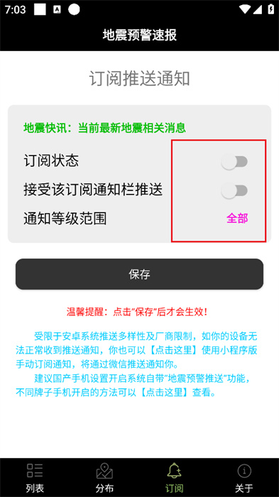 3、紧接着,切换到【订阅】页面,将这里的开关开启,可以第一时间收到地震的最新资讯;