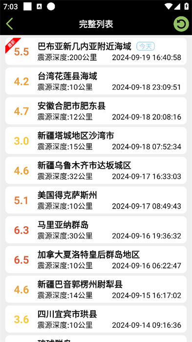 4、最后,回到首页【列表】,这里给大家呈现了全部地区的地震情况,可以在线点击来查看。