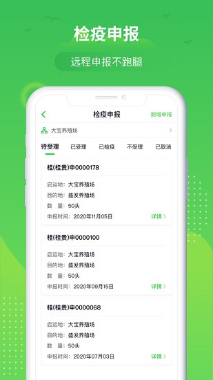 支持多个养殖场查询和切换,统一管理,信息一目了然,业务办理内容和状态详尽。