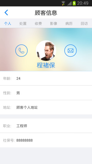 模块显示医生服务的所有顾客,医生可根据名称、手机号或最近就诊信息搜索顾客,进入顾客信息,可查看到顾客个人信息,处置记录、收费记录、影像记录、病历记录、回访记录。