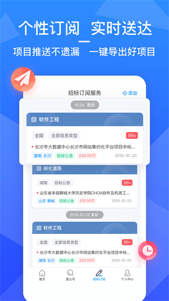 3.招标推送:全国招标信息随心订阅,随时随地即时推送,定制招标项目批量导出。