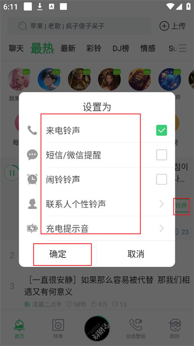 4、紧接着,点击【设铃声】会自动弹出弹窗,选择第一个【电话铃声】并点击确定;
