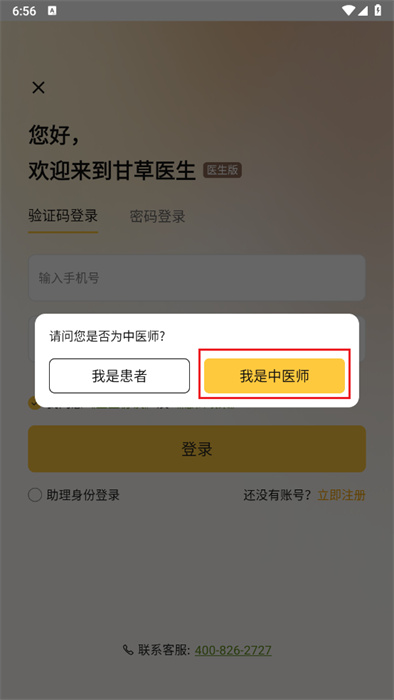 6、此时将会出现一个弹窗提示,询问用户是患者还是医生,需要点击【医生】按钮;