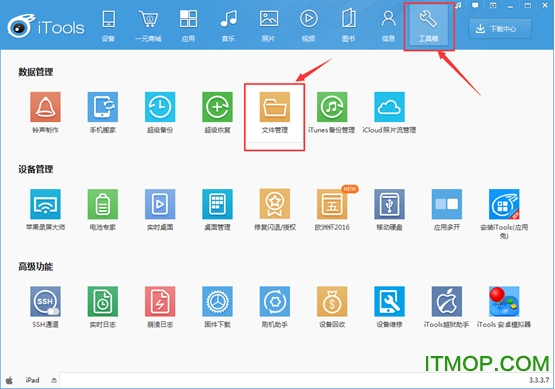 2 将手机通过数据线连接电脑,打开iTools,进入文件管理;