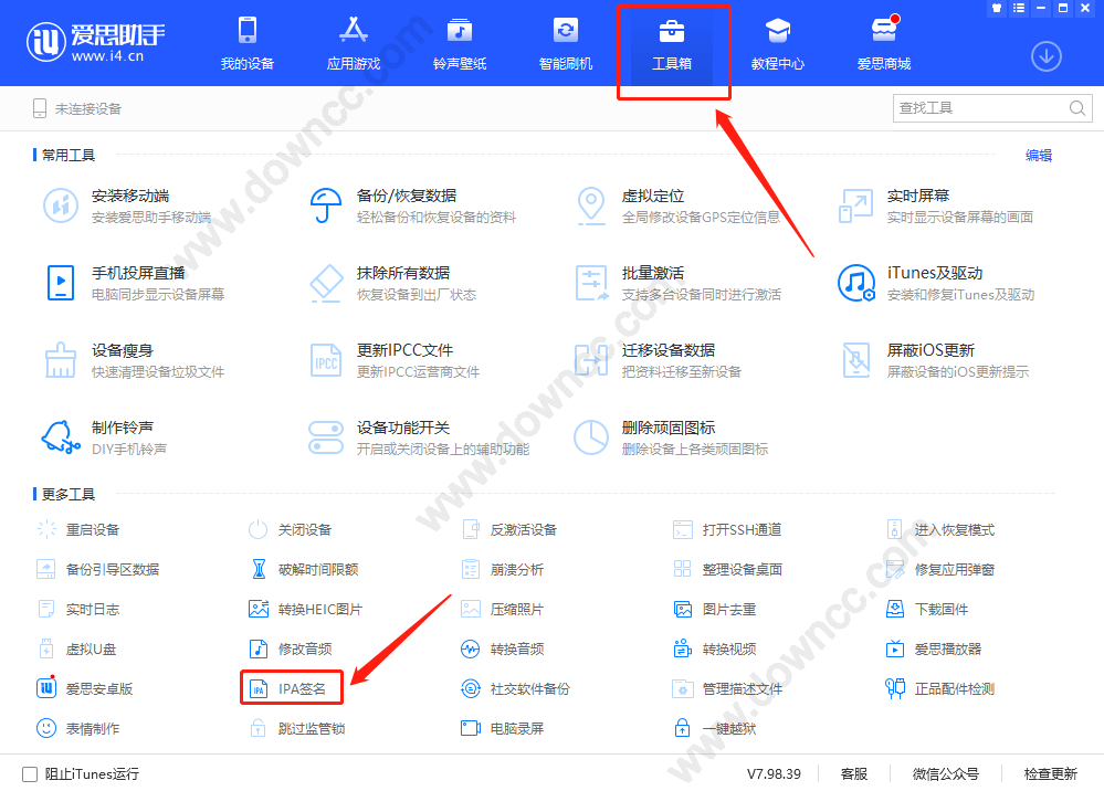 安装爱思助手,打开爱思助手的工具箱,下面有一个IPA签名: