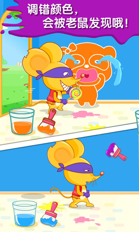 宝宝们快点来宝宝巴士的魔法调色屋帮助熊猫妙妙吧,贪吃的老鼠要抢走妙妙的棒棒糖啦,快利用不同颜色混合变色的力量来帮助妙妙吧!