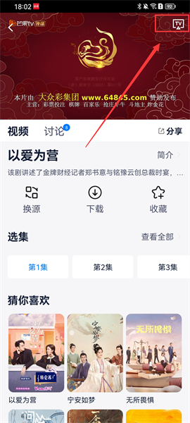 2、进入播放页面后,点击右上角的“TV”标志,这就是我们的投屏按键,如下方箭头所示;
