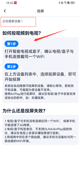 3、点击页面就会跳转到搜索设备页面,大家找到自己的连接设备,点击连接即可投屏,页面也给大家提供了详细的投屏步骤,用户可以根据步骤进行操作。