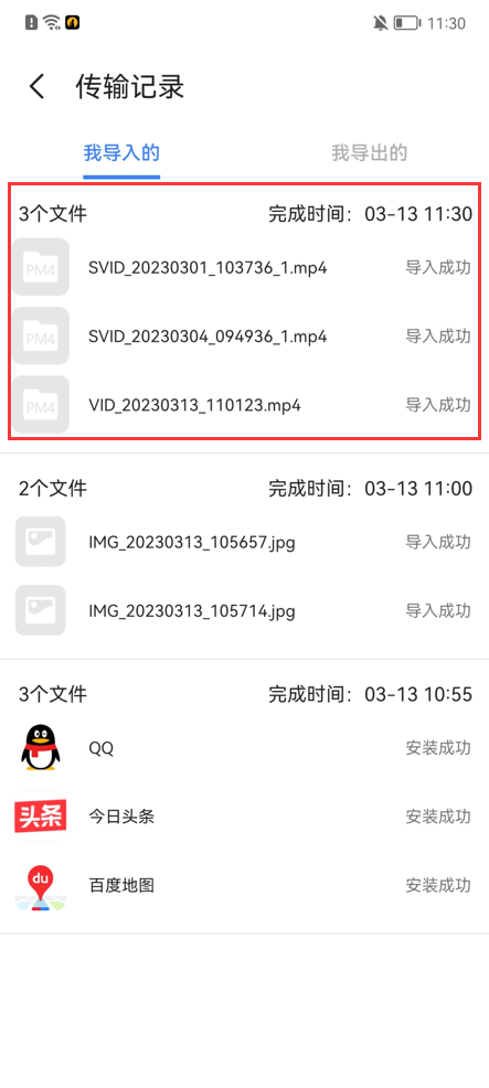 5、成功导入后,可在传输记录中看见已导入的视频记录。