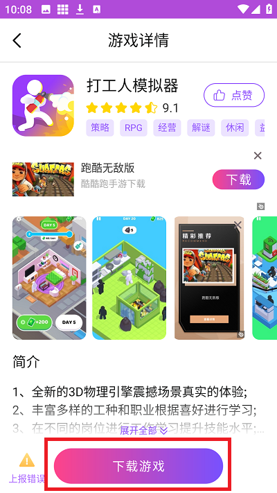 3、在游戏详情界面,直接点击下方的【下载游戏】就可以安装游戏到手机上,然后就可以打开游戏进行体验;