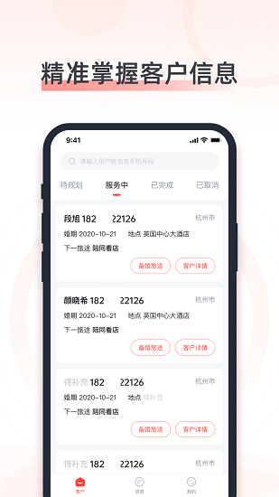 【精准掌握客户信息】管理客户的备婚信息,记录备婚喜好,备婚的状态,统筹客户标签。及时为客户提供阶段性的服务。