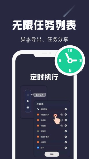 AI自动连点机器,定时执行任务,可自动收能量 、自动签到、一键连招等等。录制定时执行任务,可实现快速循环操作,将繁杂重复操作放在睡后自动执行。灵活录制流程,随心配置。只要你想得到,都能做得到,开发者在线指导。脚本灵活导入导出。人工智能时代,解放双手,用脑子思考。
