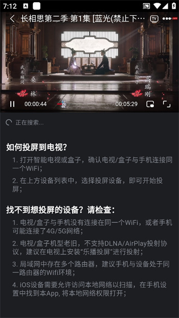 3、之后下面便开始搜索周围的设备,当搜索到之后就可以进行投屏,当搜索不到的时候可以阅读下方的提示,看看自己投屏所处的环境是否正确再继续操作;