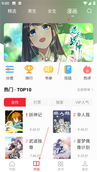 打开书城栏目,通过漫画分类可以看到热门、完结、热评等漫画资源