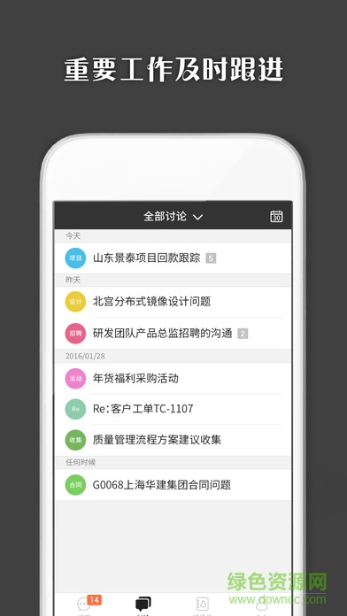 以讨论的形式聚合每项工作的所有参与人和相关资源,帮助用户随时交流工作难点、跟进工作进度、回顾工作内容、分享工作文档;