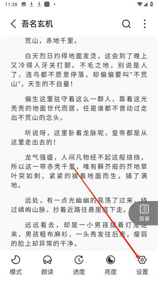 2、进入阅读界面后,点击任意一处,在打开的功能选项中选择右下角的设置;